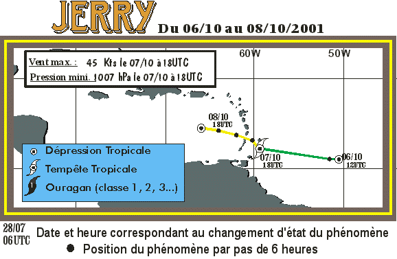 (pression minimale 1003 hPa, vent maximum soutenu 85 km/h le 7)